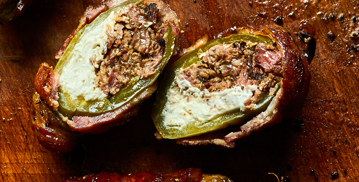 Vul de onderkant van de jalapeno pepers in met roomkaas, wij gebruikten 1 eetlepel om de onderkant te vullen. Na de roomkaas vulden wij deze nu in met 10-20 gram fijn gesneden brisket. Nu kunnen we de jalapeno dichtmaken door de 1 spekreep erom heen te draaien en doe alle stappen nu overnieuw met de andere jalapeno pepers.